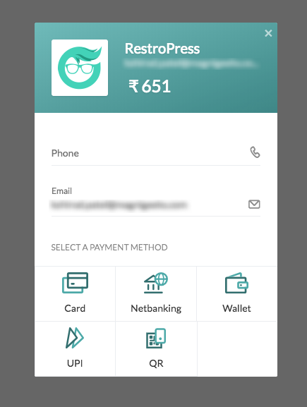Razorpay payment gateway plugin for RestroPress allows admin/store owners to accept credit cards, debit cards, net banking, wallet, UPI payments, etc. It allows customers to pay on your website with seamless integration, without being redirected away. This allows for refunds, works across all browsers, and is compatible with all WordPress websites.